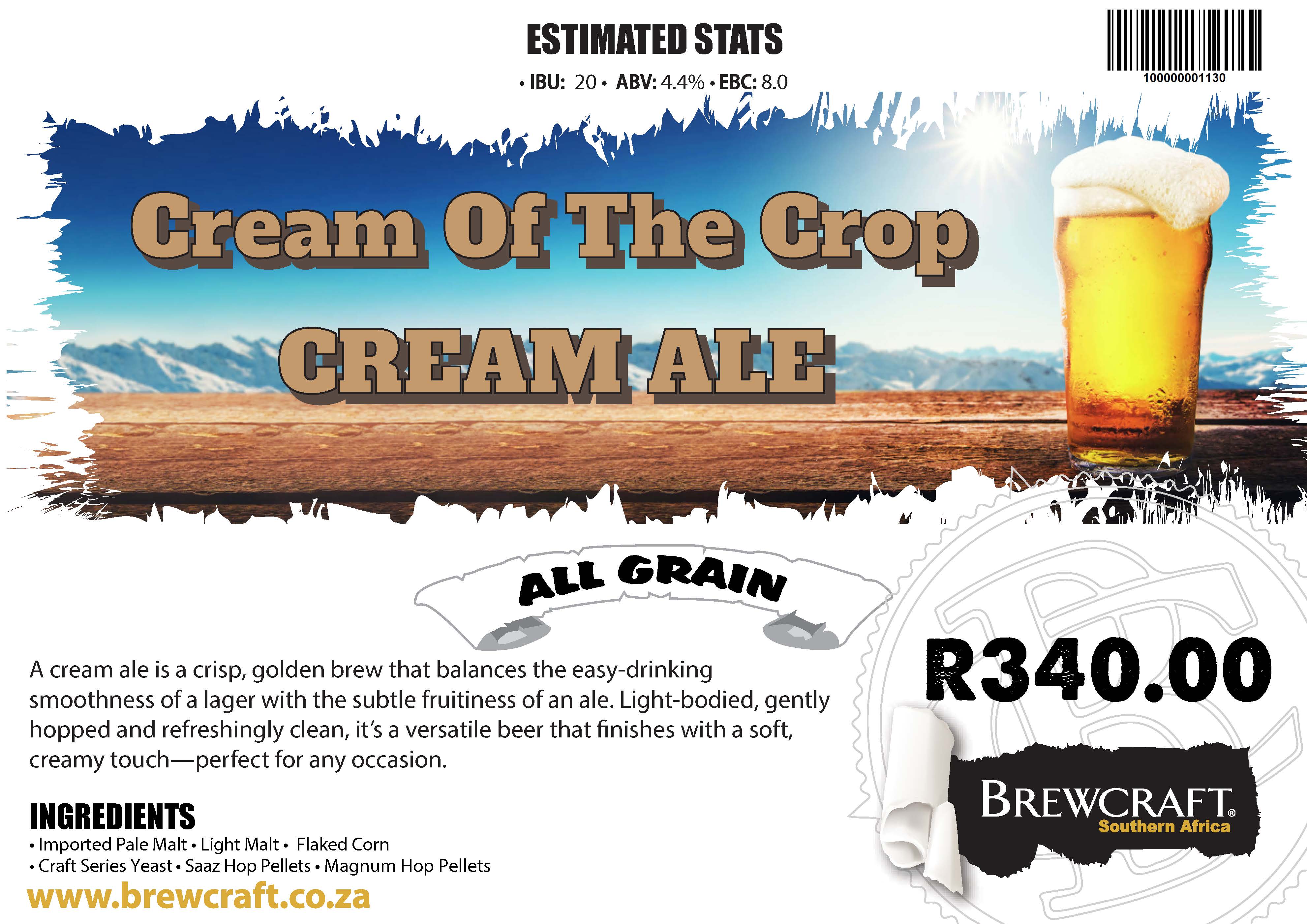 A cream ale is a crisp, golden brew that balances the easy-drinking smoothness of a lager with the subtle fruitiness of an ale. Light-bodied, gently hopped and refreshingly clean, it’s a versatile beer that finishes with a soft, creamy touch—perfect for any occasion.