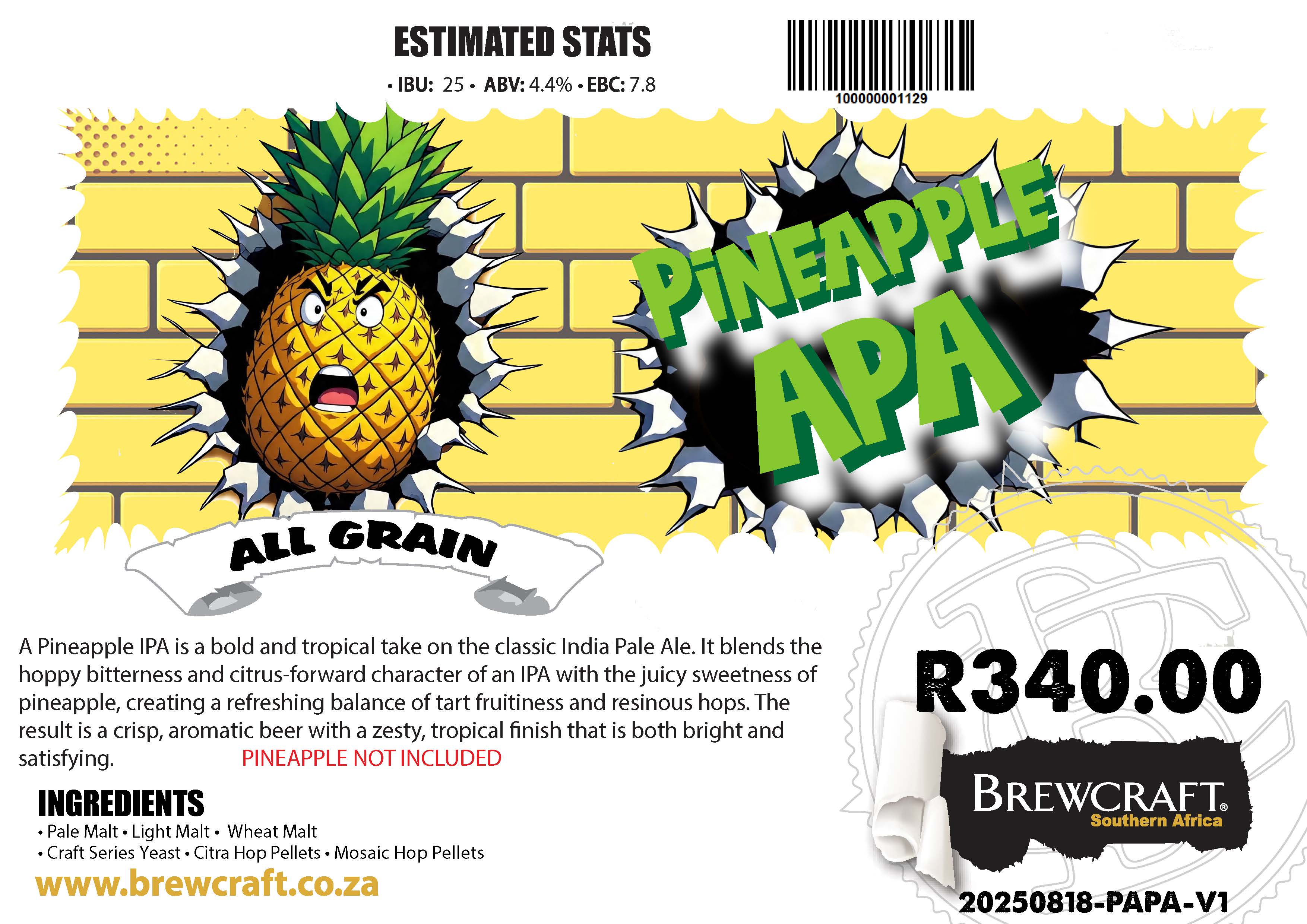 A Pineapple IPA is a bold and tropical take on the classic India Pale Ale. It blends the hoppy bitterness and citrus-forward character of an IPA with the juicy sweetness of pineapple, creating a refreshing balance of tart fruitiness and resinous hops. The result is a crisp, aromatic beer with a zesty, tropical finish that is both bright and satisfying.